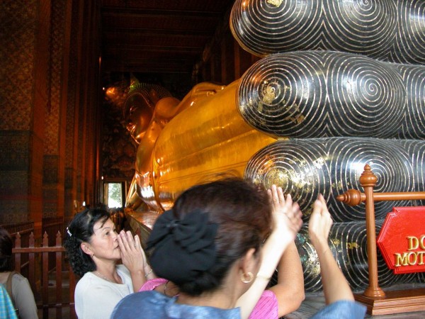People ignoring the "Do Not Touch" sign at the Reclining Buddha, Grand Palace, Bangkok.