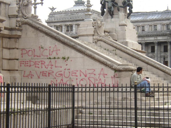 Political grafitti outside the parliament building in Buenos Aires. There is grafitti on all the monuments, and especially on the walls of the banks.