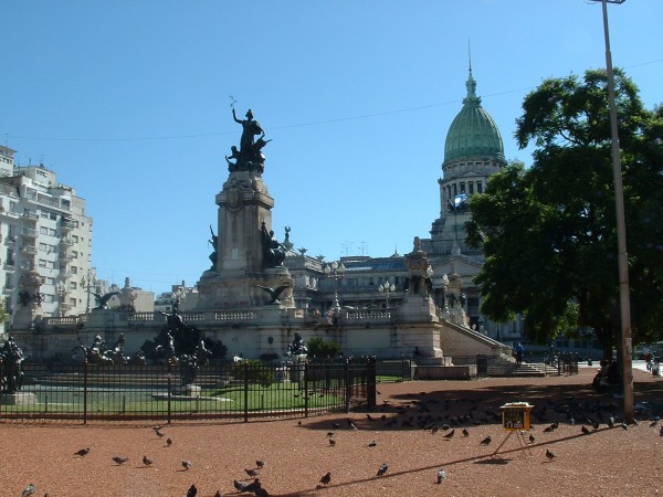 The building in the background is where the Argentine legislature sits, and was modeled after the U.S. Congress. Unlike the Congress in Washington D.C. which sits alone on a large hill, this building is jammed in among other buildings, with the exception of the plaza across to the street to the east (in the foregound).