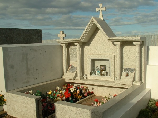Though not the most extravagant monuments in this cemetary, this grave shows the practice of incorporating cases into the headstone to leave photos and other momentos at the site.