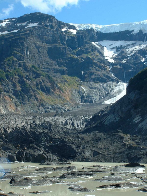 This wide angle view shows the hanging glacier at the top, which falls and picks up debris to make the black glacier below.