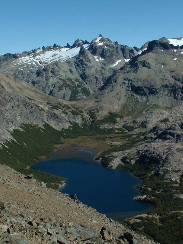 About halfway down the descent from the second ridge on the second day, Refugio Jakob (barely visible in the bottom right corner of the photo) on the edge of Lago San Martin, came into view.