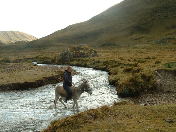 Abi on Facundo crossing a little stream on our way to Laguna Sufra Baja.