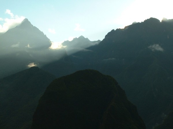 Sun rays clear mountains opposite Macchu Picchu, causing steam to rise from the jungle.