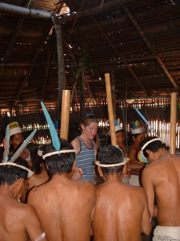 Abi gets a dancing lesson from the locals during a stop at a village in Amazonas. She was too modest to don the local attire for ladies.