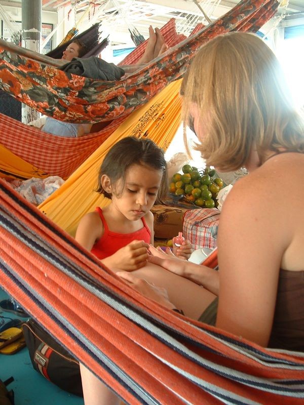 Abi gets help with her nails from one of our fellow passengers on the ferry from the Triple Frontier to Manaus. Notice how close the hammocks are.
